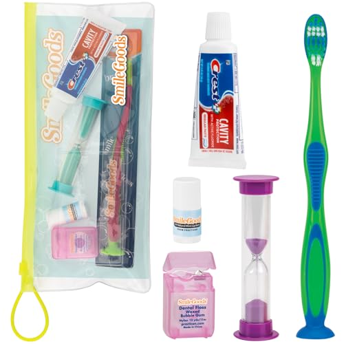 Travel Kit Includes:Y311 SmileGoods toothbrush with an ergonomic non-slip grip, flat-trimmed bristles and a suction cup base. SmileGoods waxed bubble gum floss, 0.85 oz. tube of Crest toothpaste, SmileGoods lip balm mini tube and 3-minute brushing sand timer.